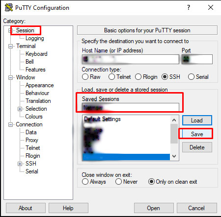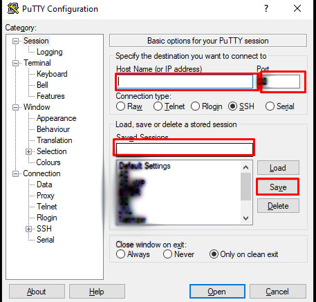 Step 5: Now open putty file and input IP in the Host name, add a post in the port field and name of the project on Saved Sessions and then click the save button.
