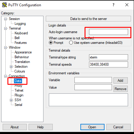 Step 6: Now go to the Data tab under connection and write username in the login details area.