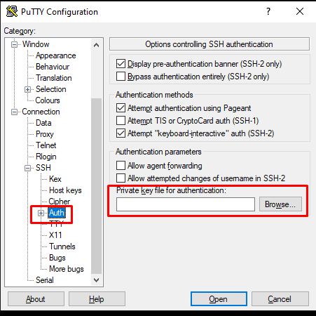 Step 7: Now go to the auth tab under ssh and browse the PPK file from the private key file section.